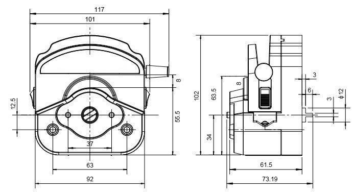 ◆YZ1515X跟YZ2515X尺寸和結(jié)構(gòu)全部相同,區(qū)別在于YZ1515X只能裝卡1.6mm壁厚的泵管,YZ2515X只能裝卡2.4mm壁厚的軟管。(壁厚